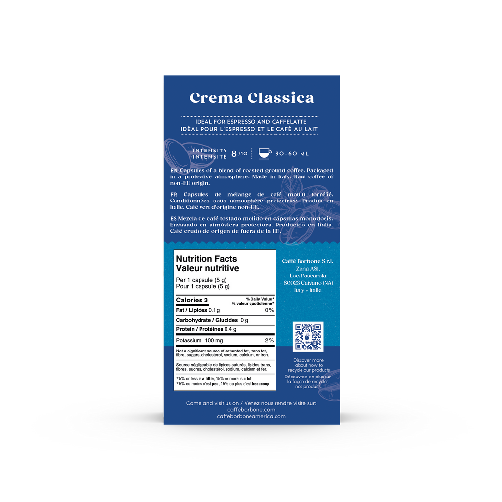 Elevate your daily coffee ritual with Caffè Borbone Crema Classica Aluminum Nespresso®* Compatible Capsules—a smooth, creamy, and authentically Italian espresso experience in every cup.