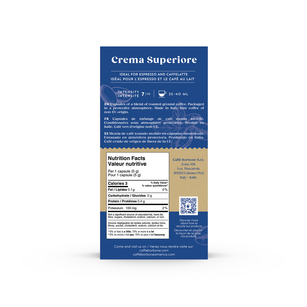 Crafted and roasted in Italy, each aluminum capsule is individually sealed to lock in freshness, aroma, and flavor, protecting the coffee from light, air, and moisture. The result is a consistently luxurious espresso experience, cup after cup. Crema Superiore shines as a classic espresso or lungo, and it’s especially well-suited as the base for cappuccinos, lattes, and iced coffee drinks where a creamy, rounded profile really stands out.